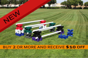 No More Aluminum! This new jump standard is made with maintenance free polyethylene. “Training Standards” won’t fade, crack or chip. Better than aluminum, because there are no dangerous metal feet. No more paint that chalks up, no more paint chipping, no dents, no re-painting or maintenance. These standards are perfect for home, the practice ring or part of your jump course. The 68″ high, hybrid size provides jumping up to 1.65 meters or over 5’3″. Includes a strong Metal Keyhole Jump Cup Track for pinless jump cups. For windy areas each foot can be filled with up to 5 pounds of sand.