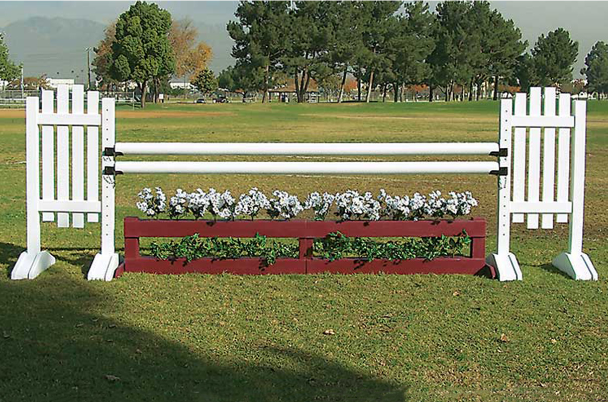 This package includes: 3 pr. schooling standards 5ft, 1 pr. schooling standards 6ft, 2 pr. solid color standards, 3 pr. two-tone standards, 7 striped poles, 6 solid color Polywrap poles, 1 brush box, 1 set picket wall, 3 pr. 3 sets flower boxes, flowers, and jump cups.