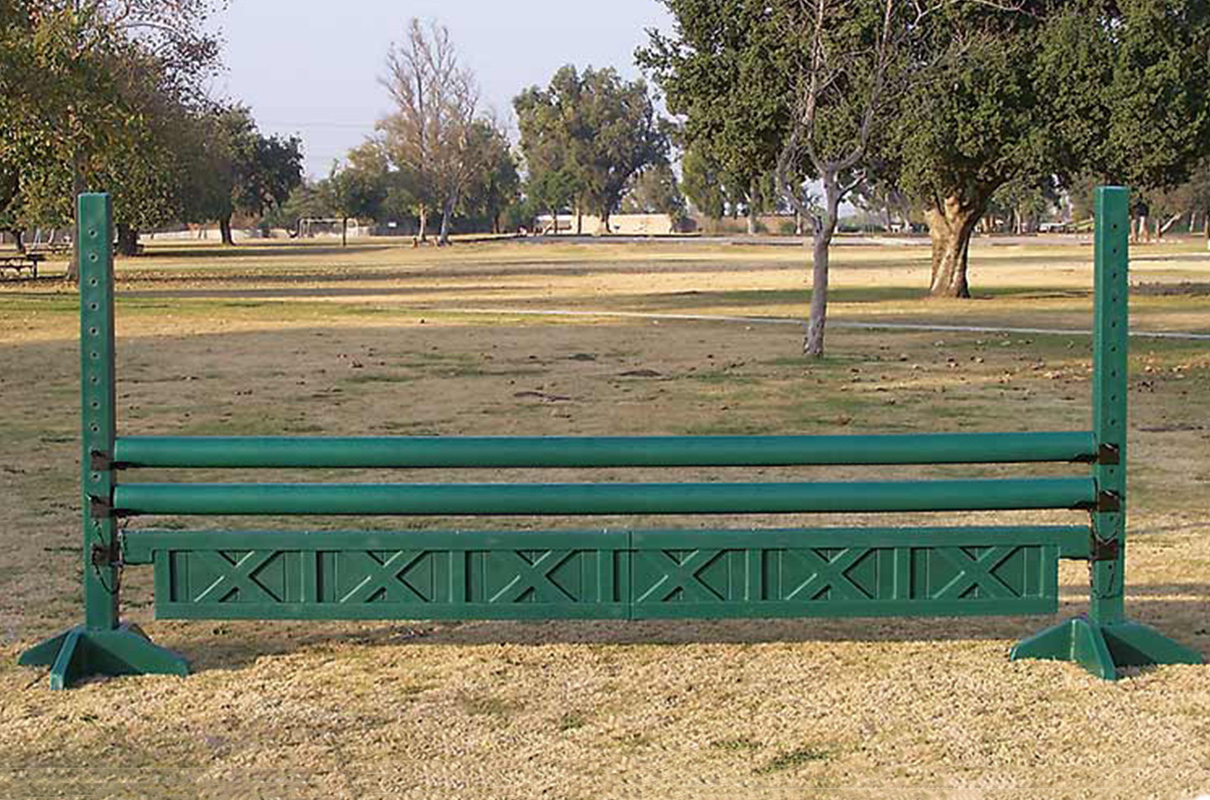 The Burlingham Sports – 6 Jumps Package includes six complete jumps with everything shown in the pictures. Jumps come fully assembled, just attach the jump feet, standards have height marks! The standards come with solid pinholes or you can upgrade to pinless keyhole jump strips, if you prefer pinless jump strips.