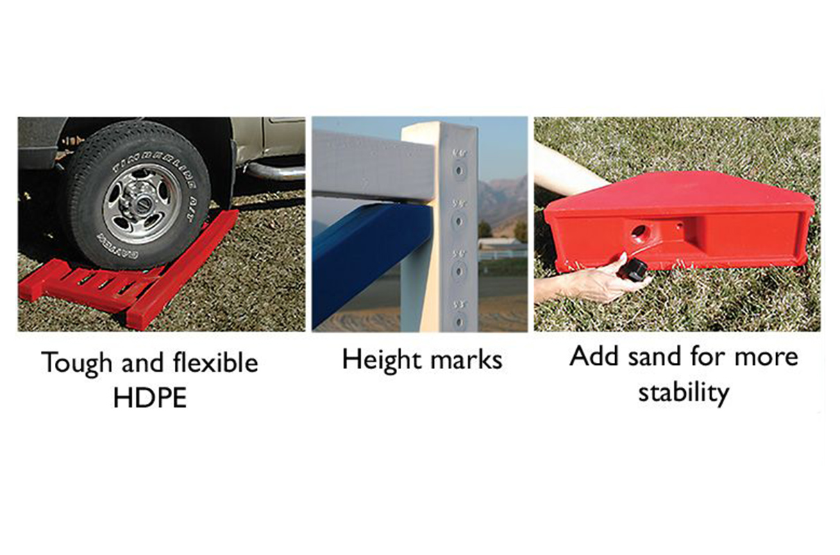 Picket 5ft Solid Color Jump Standards are sold in pairs with plenty of features like heights marked from 1’3” to 4’9” and solid slide-through pinholes. The Jump Standards are molded in one piece and base feet can be filled with sand for added stability. Each Standard weighs 25 lbs. Comes with regular pinholes or upgrade to pin-less system.